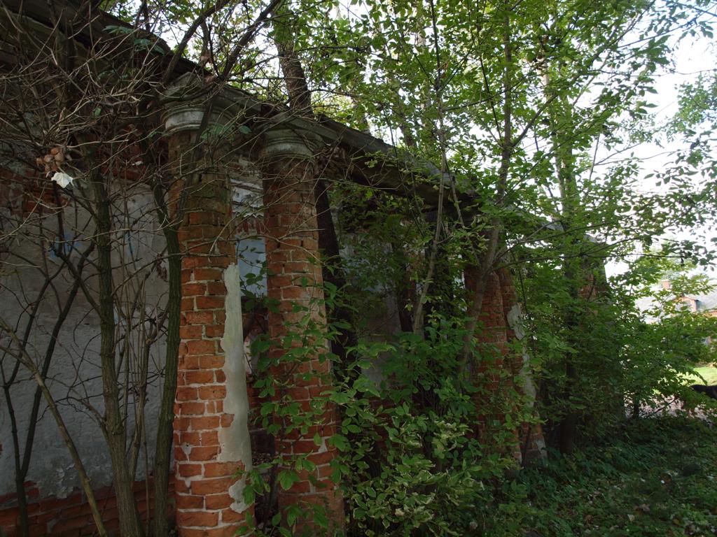 Od południa istniał ganek kolumnowy. Od północy (od strony drogi) po obu stronach ryzalitu rozciągały się podcienia, każde wzbogacone czterema parami murowanych z cegły kolumn. Kolumny i gzyms wieńczący były w porządku toskańskim. Bazy kolumn, wykonane z kamienia spoczywały na ceramicznej posadzce.