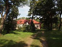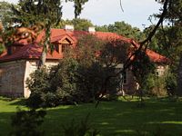 Odnawiany budynek dworu. Pokryty czerwoną dachówką.